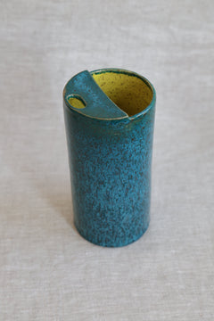 A vibrant take on a daily essential, this speckled to-go cup brings together rich turquoise and warm yellow tones for a bold yet balanced look. The layered glazes create depth and movement, while the natural clay beneath adds an earthy foundation.