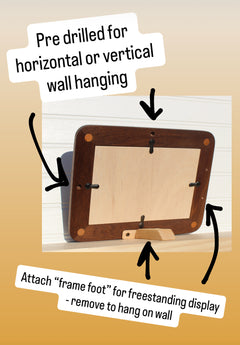 The newly designed easel back now features a “frame foot” with pre-drilled holes for horizontal or vertical display. Or, skip the frame foot and hang it on the wall instead!