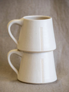 This lightweight mug features a wide base and straight walls, making it sturdy and hard to knock over. A graceful pulled handle feels great in your hand and the sides have a minimalist vertical stripe revealing the clay body underneath the glaze.