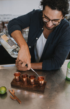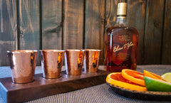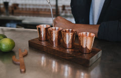 Four copper shot glasses rest atop a hand-carved walnut board, perfect for serving salts, garnishes, or mezcal in style.