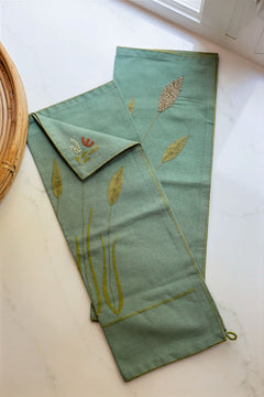 Rooted in tradition and inspired by the rich agricultural landscapes of southern India, these Tea Towels feature a serene sage green base adorned with intricately hand-embroidered stalks of Sorghum Millet—a vital grain in many rural Indian communities.