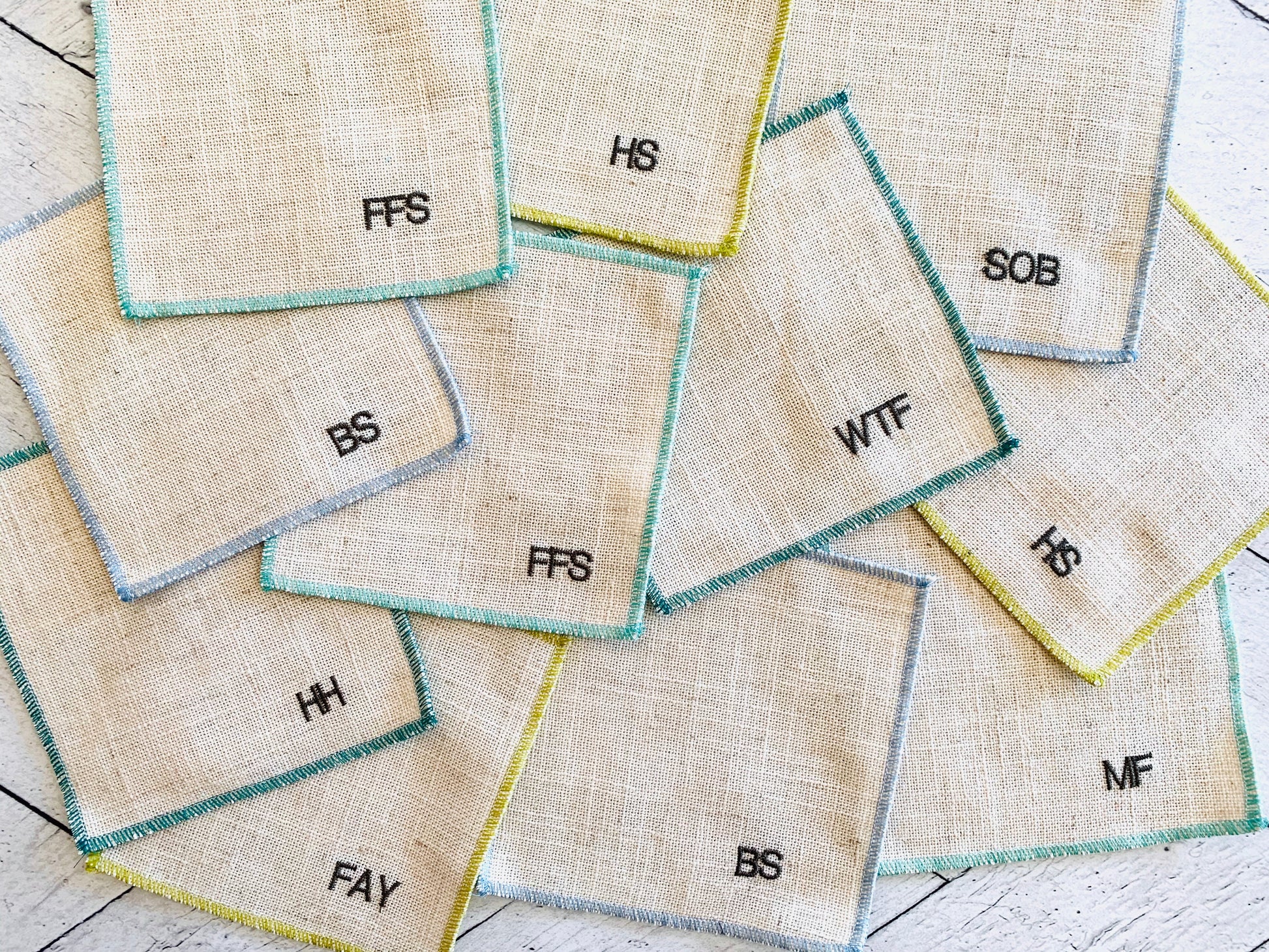These Sweary Cocktail Coasters are a witty and stylish addition to any bar cart or cocktail party. Each set includes eight beautifully handmade coasters, each featuring a letter that represents a playful swear word—perfect for guests with a sense of humor. Crafted from a durable linen and poly blend, they combine quality craftsmanship with lighthearted fun.