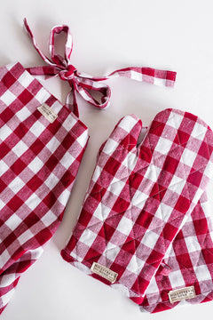 Coordinating Oven Mitts, Pot Holders, and Dish Cloths are available to complete the set! Available in Red and Gray.