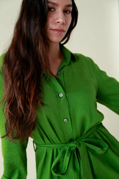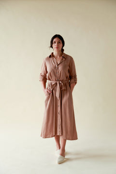 An effortlessly elegant staple crafted from a breathable blend of hemp and vegetable silk. The dress features a beautiful silhouette, foldable sleeves, and natural shell buttons for a look that’s equal parts tailored and relaxed.