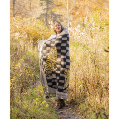 A modern take on the hand-drawn animals of hooked rugs from the American Folk Art period, Three of Cats shows feline friends doing what they do best in patterned fun: relaxation. Curl up in the softness of 100% Egyptian Cotton in Madder Root, Leopard’s Bane, and Tabby. One of Biquette's most popular throw blankets.