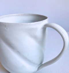 A sculptural mug created on the potter's wheel and hand altered to achieve the spiral effect. Made of stoneware clay and high fired in a natural matte white glaze, this piece adds a sense of elegance to your daily ritual.