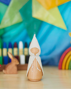A handcrafted wooden gnome with a hand-stitched wool felt coat, perfect for imaginative play and storytelling. Made from sustainably sourced materials, this heirloom-quality Wonderheart gnome inspires creativity for children and adults alike.