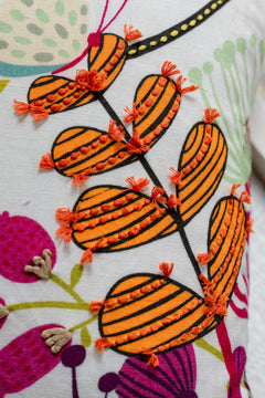 Celebrating the splendor of diverse flowers, these "pillow covers" pay tribute to the beauty of nature. The intricate designs are transferred onto the fabric using a reactive printing technique, further elevated with delicate fringes and exquisite Kantha embroidery, skillfully handcrafted by women artisans from West Bengal, India.